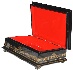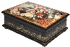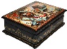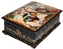 Various shades of brown tempera paints predominate here. Gold paint is used to fill the scene with shining details. The edges of the lid are adorned with gold beads. Gold beads can be also found wrapping around the bottom part of the box's base. The box's sides are decorated with elegant gold leafy patterns.