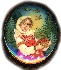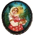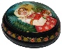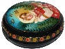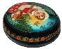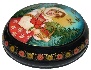 Description: This small round shaped box is a splendid specimen of traditional Mstera lacquered miniature production. The work is called "Mashenka", and shows a girl standing on the sunny, forest glade with a basket filled with ripe berries. The scene is framed with a thin gold line while the box's sides are decorated with a nice floral pattern painted in gold and tempera paints.