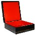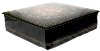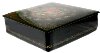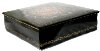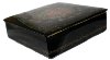 The box is made out of paper-mache. Black lacquer covers the exterior and red lacquer covers the interior of the box. The lid is hinged, and the box rests on four small round legs. The artist wrote in gold her name, Mstera, and the name of the work- "Patterns".