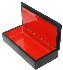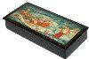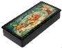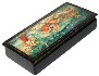 The box is made out of paper-mache. Black lacquer covers the exterior and red lacquer covers the interior of the box. The gold ornament is framed the composition. The box has a hinge above the composition and rests flat. The work is signed and titled by the artist in white paints.