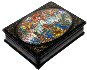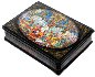 The box is constructed from paper-mache. Black lacquer is used to paint the exterior of the piece while red lacquer completes the interior of the work. The lid is hinged from the top and the box rests on four legs. The artist wrote his name, the title and the village name of Mstera at the bottom of the composition in gold paint.