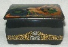 The box is hinged to the top of the composition and rests on four round legs. The artist signs his name, Palekh and a date on the bottom of the box.