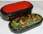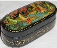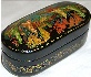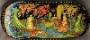 Description: This small oval box is a creation of Yevgenia Shatokhina. The work is called Golden Autumn. Here the artist has expressed her admiration for a chosen season. The crowns of trees and bushes are covered with bright red, orange, and yellow foliage. Each leaf is detailed with brilliant gold paint. Gold paint is also used to fill the landscape with dozens of minute details. Aluminum paint is used to create movement on the water.
