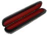 The box is constructed from paper-mache. Black lacquer is used to paint the exterior of the piece while red lacquer completes the interior of the work. The lid is hinged from the top, and the box rests flat. The artist wrote his name, the year of 2012 and the village name of Palekh along the bottom of the composition in gold paint.