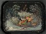 The lid of the box's exterior is covered with a high-quality Palekh style painting. The palette is filled with various shades of cold blues suitable for reproduction of a winter landscape whereas the characters' costumes are painted in warm red, orange and brown tones. Painting human figures in bright, festive colors is a recognizable trait of the traditional style of Palekh lacquered miniature.