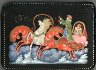 The scene is framed with a nice golden dot ornament.The box's sides are decorated with rich golden ornament. The box is constructed from paper-mache. Black lacquer is used to paint the exterior of the box while red lacquer completes the interior of the work. The lid is hinged to the top of the composition, and the box rests flat. The work is signed with the artist's name and the village of Palekh.