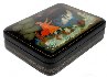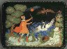 Here the artist has painted a moment when Prince Gvidon saw Princess Swan coming out from the Sea. This box that features Price Gvidon saving Princess Swan from the evil hawk's attack.