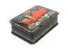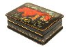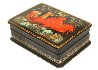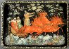 Description: Talented artist Arapova Anastasiya from the village of Palekh has painted this scene with a winter troika (the three horses sleigh) speeding through the Russian countryside. A couple hides from the snowstorm in the sleigh while a driver encourages the horses.