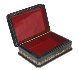 The box is constructed from paper-mache. Black lacquer is used to paint the exterior of the box while red lacquer completes the interior of the work. The lid is hinged to the top of the composition, and the box rests on four small round legs.