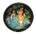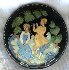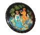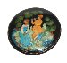The scene is painted in bright tempera paints against the black lacquered background that helps to intensify the colors.