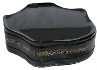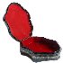 The box is constructed out of paper-mache. Black lacquer covers the exterior and red lacquer covers the interior of the box. Gold dot ornamentation frames the scene, and another expanded pattern, accented with aluminum, wraps around the sides of the box. The box has a hinge above the composition and rests on a wavy platform. The work is signed with the artist's name and Palekh.