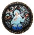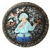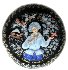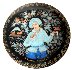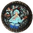 The brooch shows Snowmaiden strolling in the forest and feeding birds. The palette incorporates blue and white colors as the action takes place in winter, with addition of gold and silver paints to give a feeling of magic and splendor. The artist demonstrates his unsurpassed skill while painting the Snowmaiden's festive attire. The branches of trees covered with white fluffy snow, that are also expressively painted.