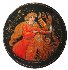 The scene is painted in bright tempera paints against the black lacquered background that helps to intensify the colors.