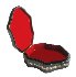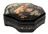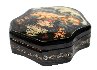 The box is constructed from paper-mache. Black lacquer is used to paint the exterior of the box while red lacquer completes the interior of the work.