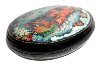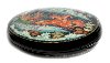 The lid is hinged to the top of the composition, and the box rests flat. The work is signed with the artist's name and the village of Palekh.