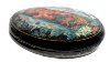 The box is constructed from paper-mache. Black lacquer is used to paint the exterior of the box while red lacquer completes the interior of the work.