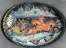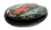 Description: Talented artist Konstantin Konovalov from the village of Palekh has painted this scene with a winter troika (three horse sleigh) speeding through the Russian countryside. Young lady hides from the snowstorm in the sleigh while a driver encourages the horses.