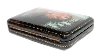 The box is constructed from paper-mache. Black lacquer is used to paint the exterior of the box while red lacquer completes the interior of the work.