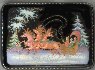 Description: Talented artist Olga Abramova from the village of Palekh has painted this scene with a winter troika (three horse sleigh) speeding through the Russian countryside. A loving couple hide from the snowstorm in the sleigh while a driver encourages the horses.