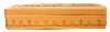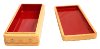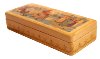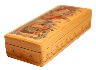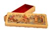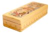 The box is made out of paper-mache. The interior of the box is red, while the exterior is covered with white lacquer, which came to look like yellow after covering with oil-based lacquer. The lid is not hinged, and the box rests flat.