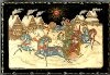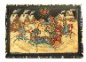 Description: Talented Luba Kortikova of Palekh is the artist who painted this interesting scene of three speeding winter troikas.
