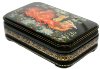 The box is constructed from paper-mache. Black lacquer is used to paint the exterior of the box while red lacquer completes the interior of the work. The lid is hinged to the top of the composition, and the box rests on four legs. The work is signed with the artist's name, date (2012) and the village of Palekh.