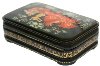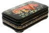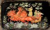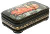 Description: Talented artist Arapova Anastasia from the village of Palekh has painted this scene with a winter troika (three horse sleigh) speeding through the Russian countryside. A loving couple hide from the snowstorm in the sleigh while a driver encourages the horses.