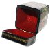 The box is made out of paper-mache. Black lacquer covers the exterior and red lacquer covers the interior of the box. Golden ornament frames the composition, while ornamentation wraps around the sides of the box with an expansive format.