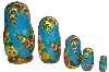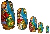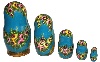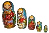 The theme of this work is Russian folk fairy-tale "Geese and Swans". On the place where sarafan is usually painted the artist depicts some recognizable scenes from the tale. The first and the biggest nesting doll shows the happy end of the tale. The girl managed to save her little brother Ivanushka from Baba-Yaga and to return home to her parents. On the second doll the artist depicts Geese and Swans kidnapping Ivanushka by Baba-Yaga's order. The third doll features sister Alyonushka and brother Ivanushka escaping from Geese and Swans. The fourth doll depicts Baba-Yaga's wooden hut on chicken legs. The fifth and the smallest doll shows the magic apple tree who saved the children from Geese and Swans. The biggest doll is signed with the artist's name, the year of 2010, and Russia.