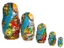 Description: This attractive set of nesting dolls is an original author work of Nadezhda Romenskaya. The set includes five brightly colored, wooden dolls. Each of five dolls has the same neatly painted face and wears a beautiful Pavloposadsky shawl.
