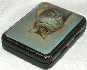 The box is constructed from paper-mache. Black lacquer is used to paint the exterior of the box while red lacquer completes the interior of the work. A hinge is fastened to the left of the scene, and the box rests on a flat bottom.