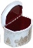 The box is constructed from paper-mache. The exterior of the box is painted with cream lacquer while the interior is completed with dark red lacquer. A hinge is fastened to the top of the composition and the box rests on a flat bottom. The work is signed with the name of the artists and the village of Fedoskino.