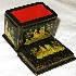The box is constructed out of high-quality paper-mache. Black lacquer is used to paint the exterior and red lacquer is used to paint the interior of the box. For decoration Sedov applies fine gold scrollwork to the box. The scrollwork frames the composition on the lid and wraps around the sides of the box. Both designs are intricate, precise, and bring good aesthetics to the box. The lid isn't hinged and the box rests on four legs. Sedov has written the title (“The Cathedrals of Suzdal”), Kholuy, and his name at the bottom of composition on the lid.