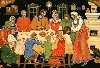 This interesting work has been created by E. Bonokina. In the center of the composition she depicts all members of a big peasant family gathered at the table, and having a dinner. The interior of a peasant house is vividly drawn here. The rest part of the composition depicts the labor working days of the Russian peasants who work in the field, pasture cattle and gather mushrooms in the forest. This box is painted to glorify the hard labor of Russian peasants, and to show the results their work when the family eats the products grown by themselves.