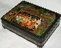 The drawing is colorful and filled with intricate details. Gold and silver paints are used with great intricacy and delicacy to develop the finer elements in the composition. Gold and silver paints are also used to decorate the box's exterior with beautiful ornaments.