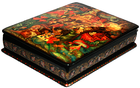 Description: Irina Peskova from the village of Palekh has painted this interesting box. It shows an episode from Lewis Carroll's classic tale "Alice in Wonderland".