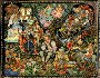 In the left bottom corner the miller's youngest son who is now known as the Marquis of Carabas is standing waist-deep in the water. The cat has hidden his poor clothes, and again deceived the king telling that his master has been robbed and his clothes disappeared. Having heard many stories about the rich Marquis of Carabas told by the sly cat, the king orders to give "the poor fellow" his most elegant suit. The king's daughter looks at the handsome cat's master, and from this moment the two fall in love with each other. In the left upper corner peasants crop wheat. Later the cat will deceive the king again saying that these peasants are the property of his master. In the right bottom corner there is the final scene of the tale showing the wedding of the cat's master and the king's daughter.